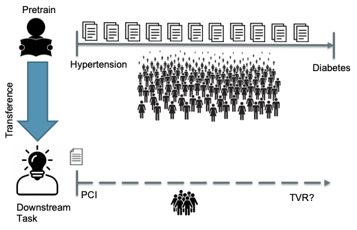 Using innovative self-supervised learning techniques, we constructed a pretrained model based on laboratory trajectories of patients with diabetes and hypertension. This model was successfully transferred to the prediction of outcomes in patients undergoing percutaneous coronary intervention (PCI), a population too small to train deep learning models independently. The approach improved prediction accuracy for target vessel revascularization (65% to 92%), major adverse cardiovascular events (52% to 71%), cardiovascular death (60% to 75%), myocardial infarction (43% to 68%), stroke (57% to 67%), and major adverse cardiac and cerebrovascular events (55% to 76%). The method requires no manual labeling, effectively handles irregular and missing values, and relies on only six common laboratory tests, ensuring no additional clinical burden.